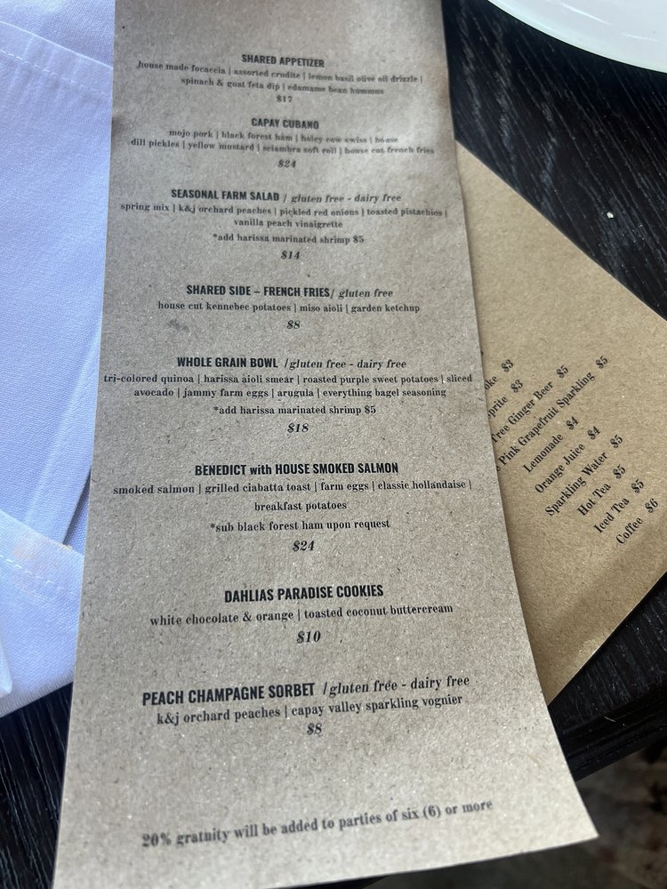 The menu features gourmet classics like house-smoked salmon benedict and savory Capay Cubano, all prepared with locally sourced ingredients. Reviewers rave about the beautiful presentation and tasty flavors, remarking on the enjoyable dining atmosphere reminiscent of a cozy wedding reception.